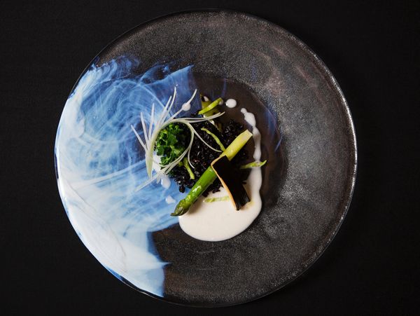 Creamy burrata, basil oil, micro basil, and a balsamic pearl garnish.